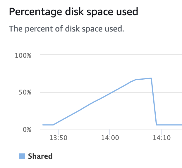 The query consumed over 60% of the total disk space on the cluster. An even slightly larger set of data would have consumed all available space leading to a “disk full” condition leading to, at least, a failure of the query.